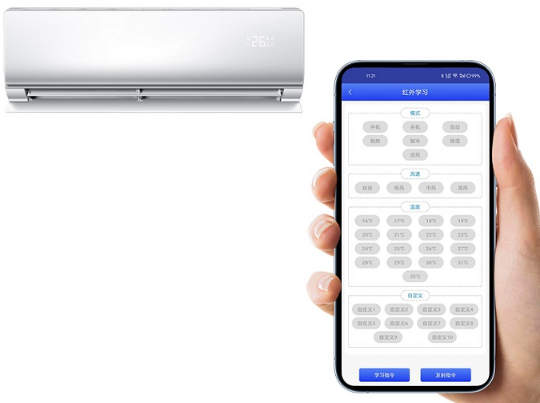 我们常用的空调控制器通常需要逐一学习空调遥控器的红外码才能进行使用,操作较为繁琐。智能空调控制器内置红外码库,能够匹配市面中99.9%的空调,通过蓝牙连接手机 APP 即可轻松完成配置,红外码库还支持通过网络远程更新,方便后续使用。