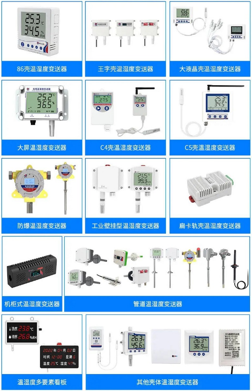 还有一些用于特殊场景的设备,比如冷链行业用于保温箱的嵌入式温湿度记录仪;用于冷藏车的4G车载多探头温湿度记录仪;用于农业的叶面温湿度变送器;用于供暖行业的供暖温湿度变送器;用于混凝土养护行业的混凝土养护专用温湿度变送器;代表人或物体实际感受温度,常用于建筑行业测量的黑球记录仪以及露点温度测量设备等。