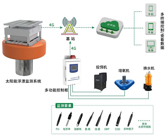 智慧水产养殖监测系统主要由水质在线监测系统——太阳能浮漂水质监测站、智能控制系统、以及综合环境监控平台组成。