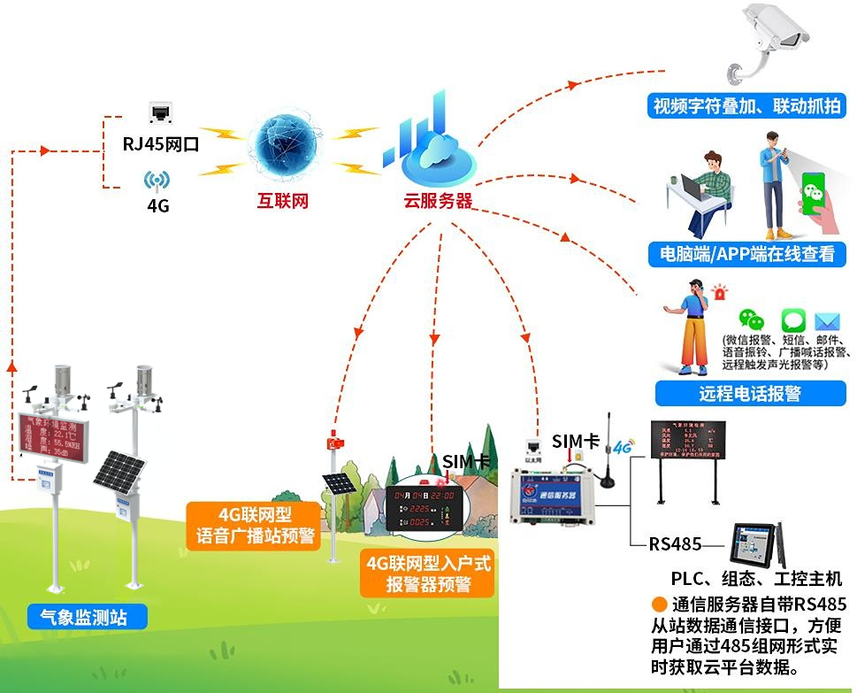 具有1路ModBus-RTU主站接口可接入我司485变送器:风速、风向、土壤温度水分、土壤ECTH、土壤PH、空气温湿度、噪声、空气质量、大气压力、光照、雨雪、紫外线、总辐射、CO、O3、NO2、SO2、H2S、O2、CO2、蒸发量、负氧离子、NH3、TVOC等变送器。
