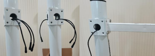 一拖三接线方式(默认):立杆内部走线,将一拖三线的母头与一根2.5米的延长线连接,将延长线一端沿微联孔伸进立杆内部,一拖三的公头留在立杆外;微联孔公头线数量和安装设备数量一致(若需要安装三个以上的设备,在一拖三线的公头上再接一根一拖三线即可),将线穿过横臂与设备上的防水对插母头接在一起,最后用四个螺丝将横臂固定牢固。