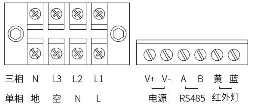 将设备接线盒外壳打开,参考上图接线示意接线: 左侧端子为单相/三相电接线处: 接线时需单独准备一根空调插头线(根据现场实际空调功率选择:单相推荐使用 16A 插头,三相推荐 25A 插头),空调本机上的插头插在智能空调控制器上方插座上,单独准备的空调插头线接到原空调插座上。