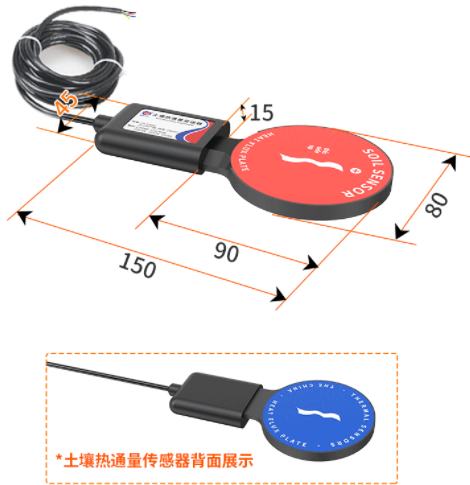 土壤热通量变送器(又称“土壤热通量板”、“热流计”)主要用于测量土壤的能量平衡和土壤层的热传导。土壤热通量变送器采用热电堆测量,该热电堆由两种不同的金属材料组成。 热电堆接收热辐射后产生温差电势,再根据算法得出热通量数值。