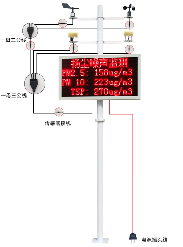 依次把4个传感器的线,顺着支架立杆固定住,扬尘一体机箱体底部会引出一根黑色的公头对插线,然后对插一根一母三公线,其中两个公头分别接下面横梁上的两个百页盒设备,然后在剩下的一个公头上再对插剩下的一根一母两公线,然后把风速、风向传感器的母头线对插在上面即可,线序并无区分。